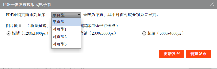 在上传PDF一键发布成电子书时,首先会让我们选择PDF原稿页面排列顺序类型,如果选择错了,会造成发布后的电子书版面错误,所以务必选择正确,如下图所示: