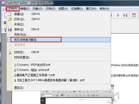 2.我们用 foxit pdf editor (下载地址:https://pan.baidu.com/s/1kWRtZNL 密码:qsq6) 打开需要转曲的PDF文件,然后菜单栏 文件-将文本转换为路径,转换完成后另存或者保存即可。