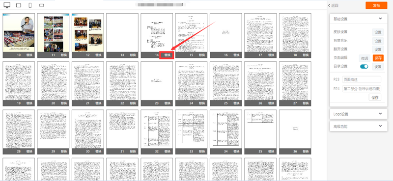 如果是小范围修改,可以登录会员中心,找到我的电子书(画册和一键生成电子书均可),打开设置界面,找到页面编辑处的“调整”按钮,单击后出现替换页面,如下图所示: