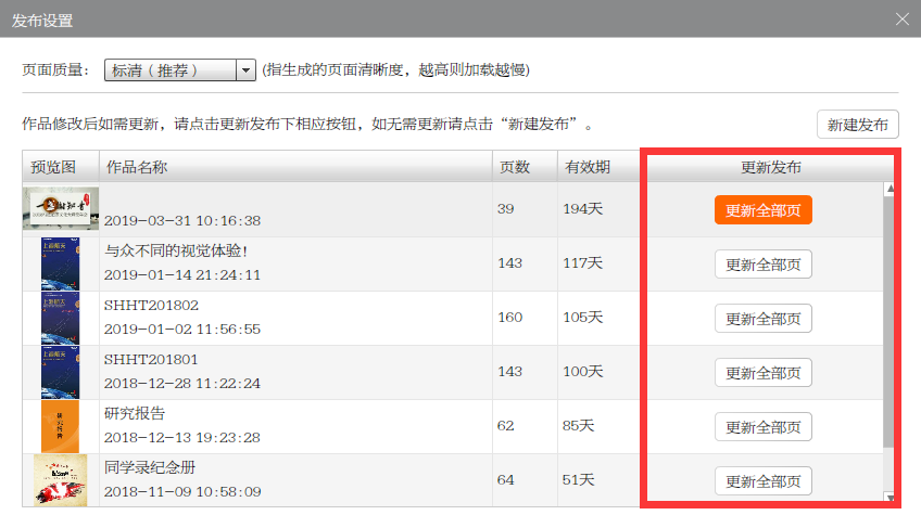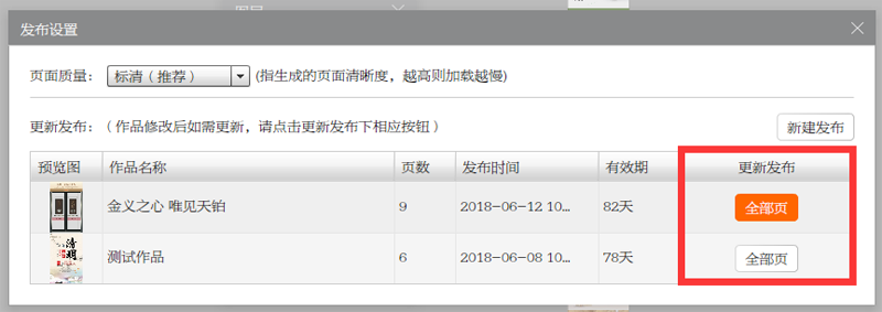 修改完成后直接点击右上角预览按钮,进行重新发布。发布过程中有个选项,是新建发布还是更新做,选择相应的作品,进行更新(修改)即可,更新后,地址和二维码不变,如果有页数增加,系统会提示缴纳新增页数的费用。如下图所示: