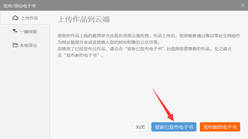 用户发布的作品是通过导入PDF或者图片文件,一键生成的电子书,在更新的时候,需要修改源文件后(比如用Adobe Indesign制作的,需要在Adobe Indesign里修改后重新生成PDF),重新生成PDF,然后再导入到有图桌面版软件里,在发布的过程中选择“更新已发布的电子书”,如下: