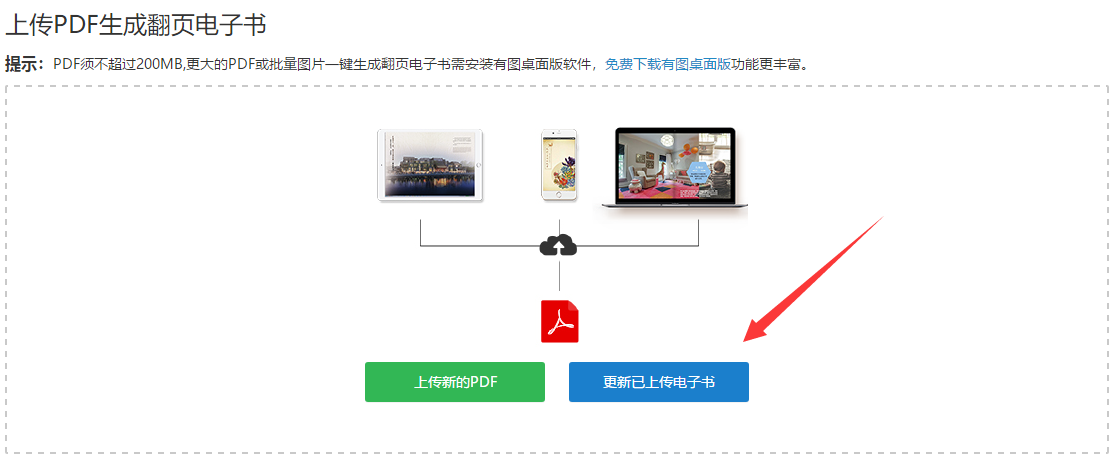 用户发布的作品是在有图官网(www.youtucc.com)直接在线导入PDF文件生成的电子书,在更新的时候,选择“更新已上传电子书”,如下图所示: