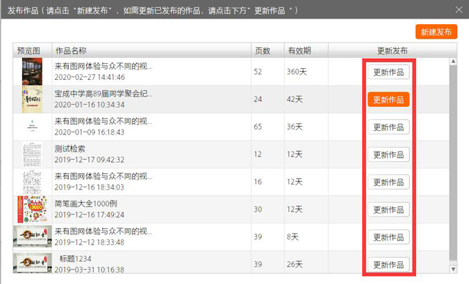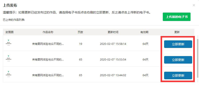 用户发布的作品是在有图官网(www.youtucc.com)直接在线导入PDF文件生成的电子书,在更新的时候,选择“更新已上传电子书”,如下图所示: