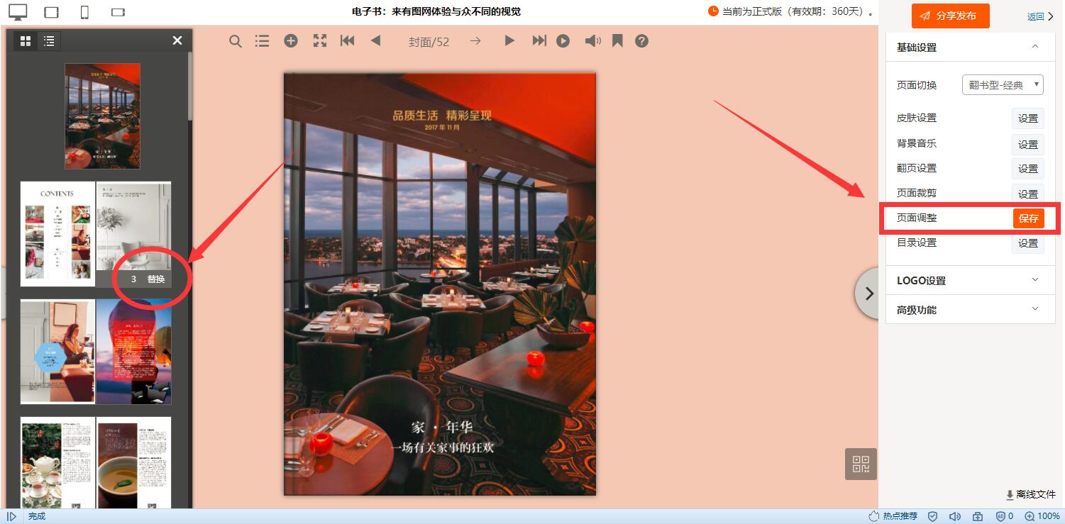 如果是小范围修改,可以登录会员中心,找到我的电子书(画册和一键生成电子书均可),打开设置界面,找到页面编辑处的“调整”按钮,在左侧出现所有页面,把鼠标放在需要替换的页面上,出现替换按钮,单击按钮后进行替换即可,如下图所示: