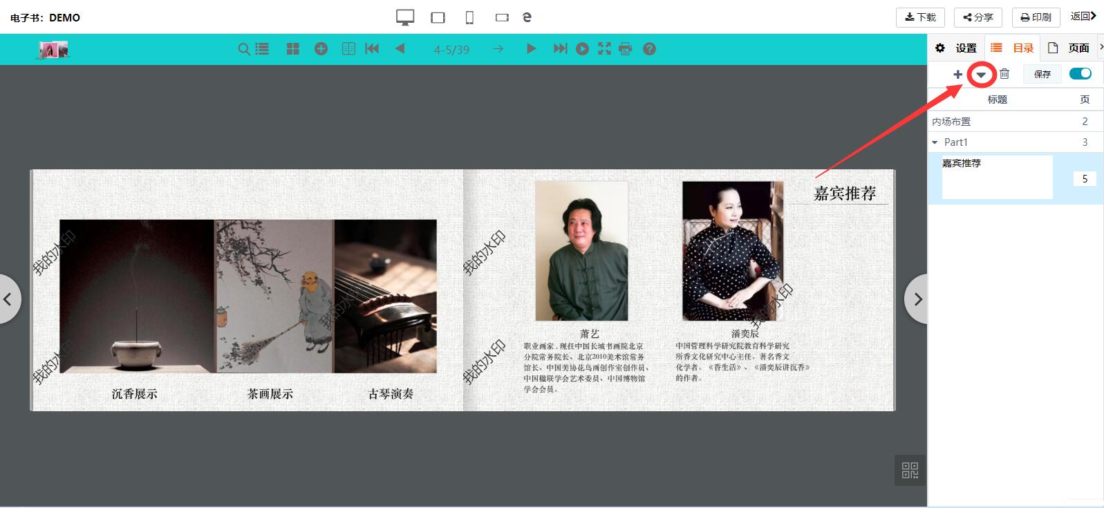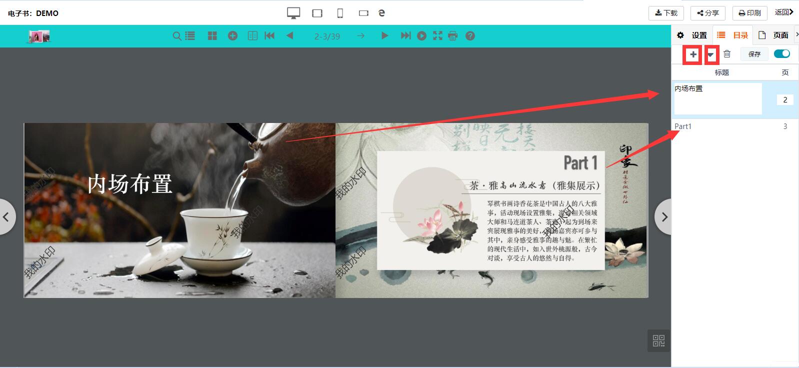 2、翻到相应页面,点击“+”按钮,手工填写目录信息和对应页码,如下图所示,P2对应左侧页面,可以填入“内场布置”,P3对应右侧页面,可以填入“雅集展示”。