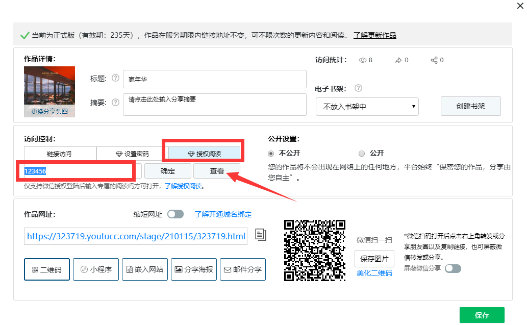 授权阅读码是为了向特定受众(比如付费阅读)提供服务的一种授权码,受众在扫描二维码时,只有输入阅读码,同时微信绑定才能阅读作品。具体操作如下: