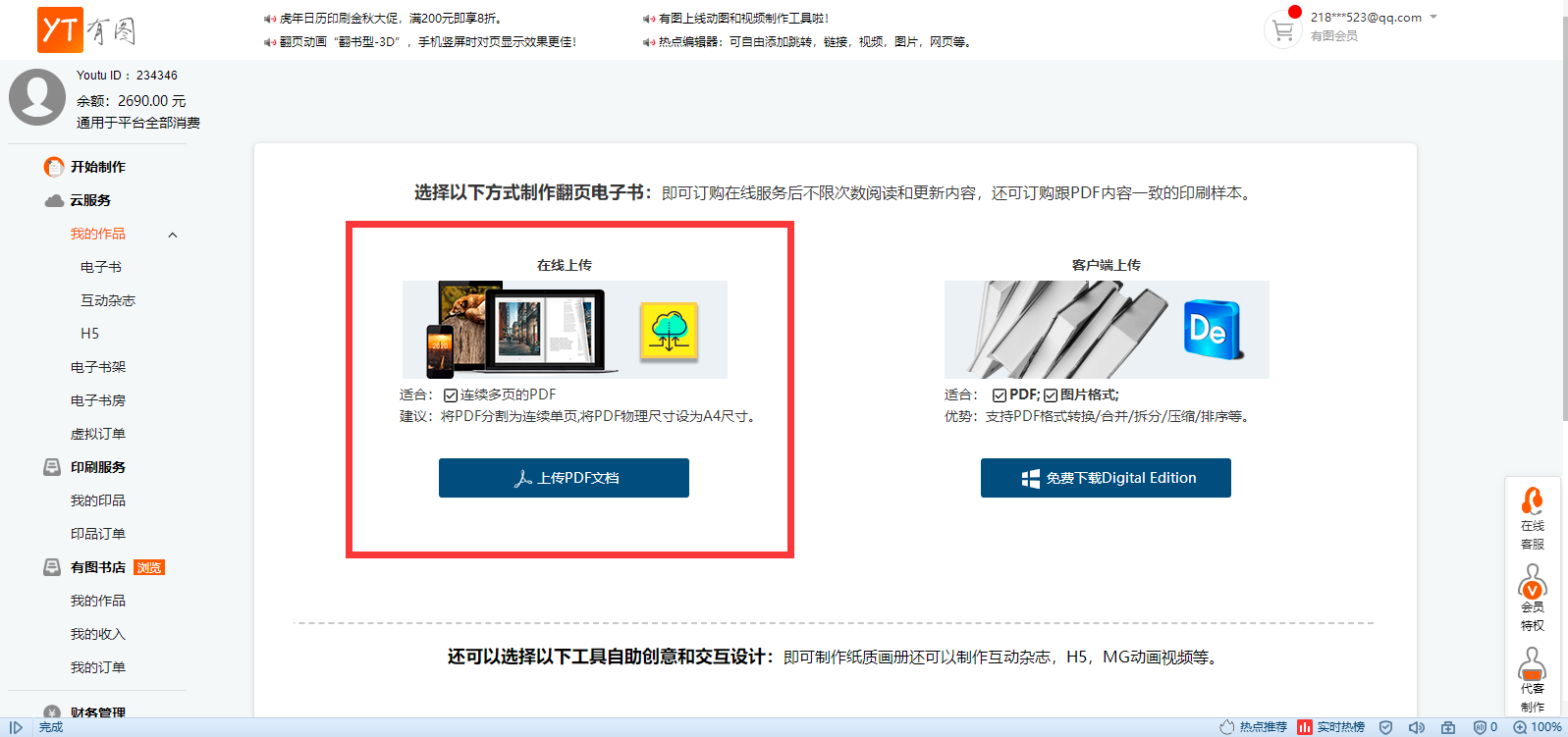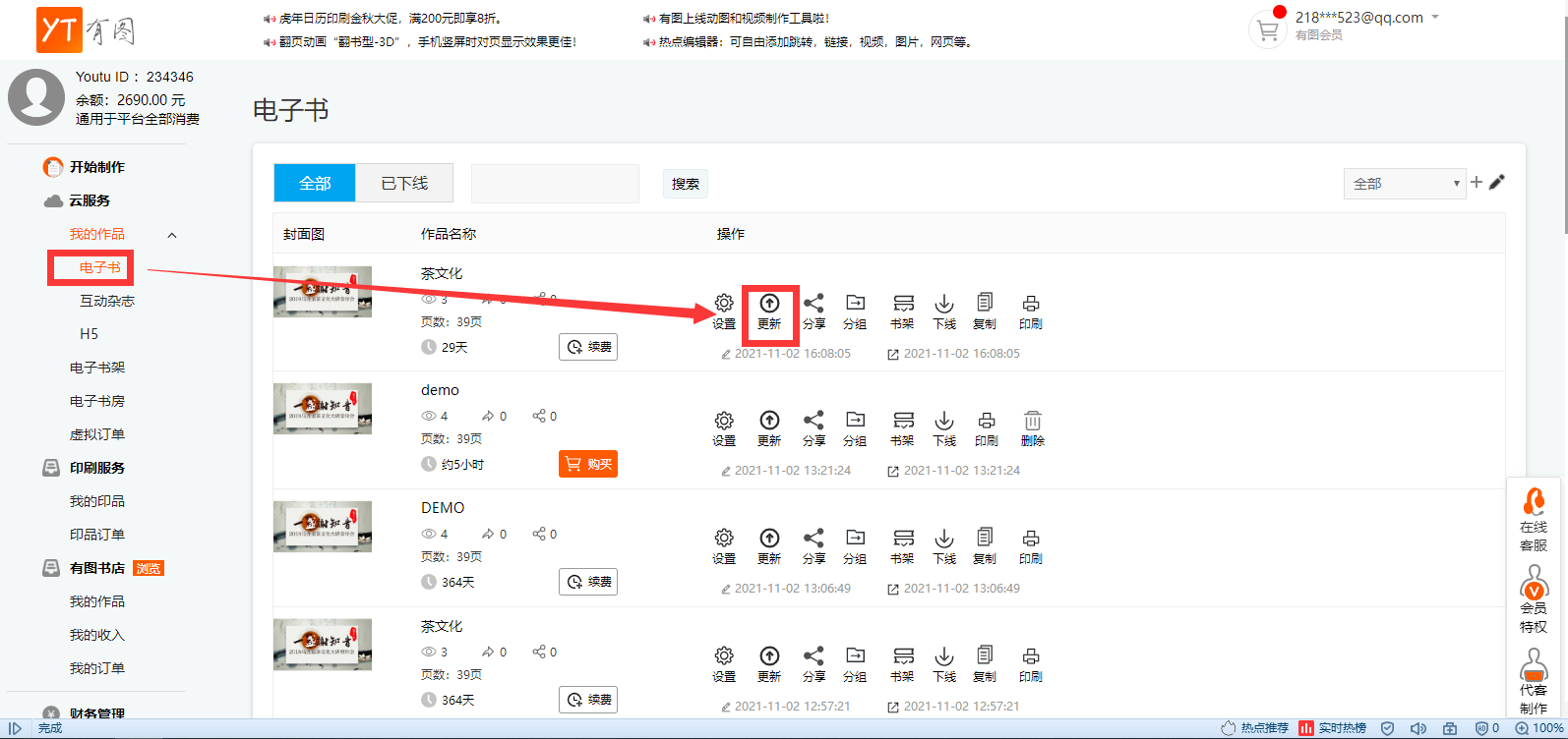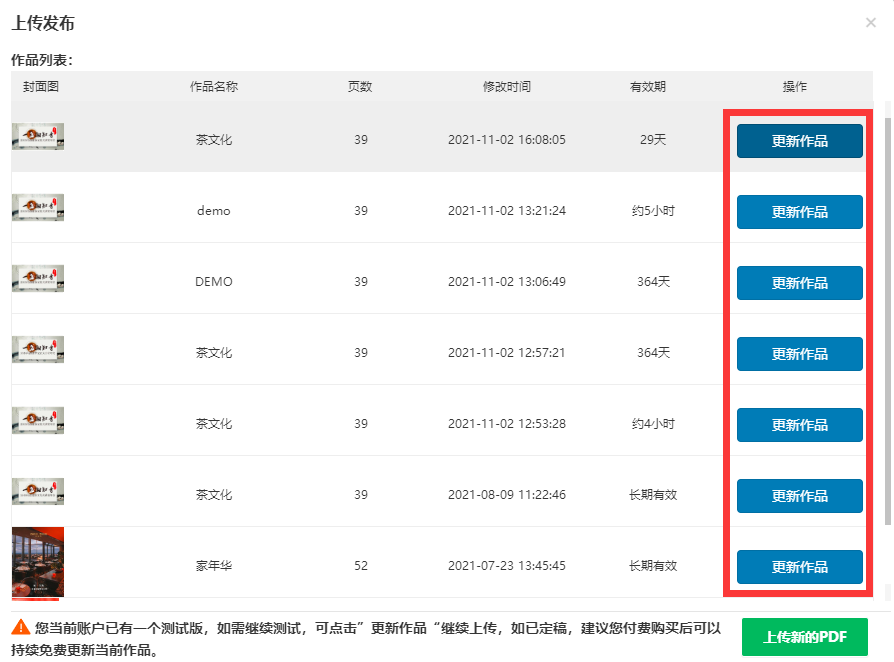 用户发布的作品是在有图官网(www.youtucc.com)直接在线导入PDF文件生成的电子书,在更新的时候,选择“更新已上传电子书”,如下图所示: